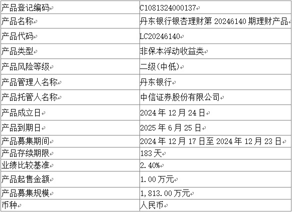 尊敬的客户: 我行发行的丹东银行银杏理财第20246140期理财产品已于2024年12月24日成立,根据与投资者的约定,现将理财产品成立情况进行信息披露,具体信息如下: