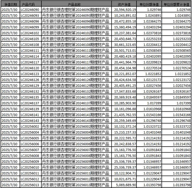 尊敬的投资者: 我行发行的以下理财产品资产净值与份额净值如下: