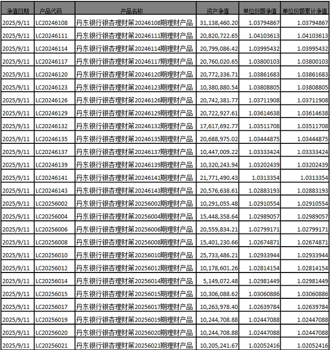 尊敬的投资者: 我行发行的以下理财产品资产净值与份额净值如下: