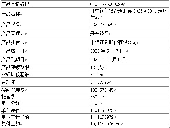 我行下列理财产品已于2025年11月5日进行到期清算兑付,根据与投资者的约定,现将到期情况进行公告,具体披露信息如下。