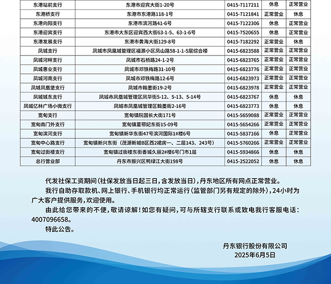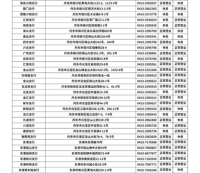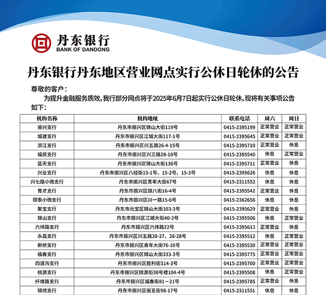 丹东银行丹东地区营业网点实行公休日轮休的公告